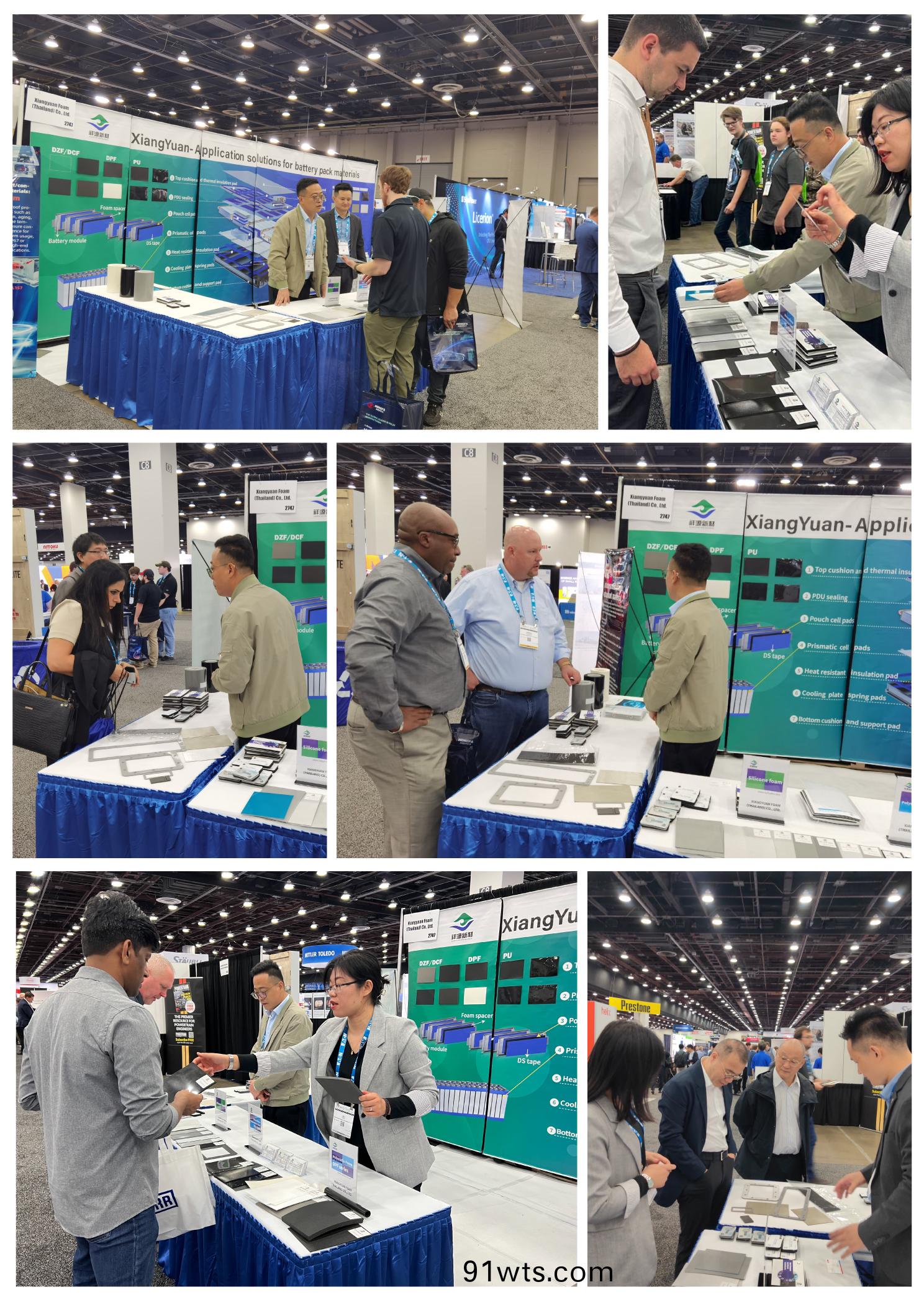 Elites from Xiangyuan International Trade Department traveled to the United States, bringing foaming materials such as polyolefins, polyurethanes, and organic silicone, as well as materials for internal and external sealing, heat insulation, support, buffering, heat preservation, flame retardant, fire prevention, and thermal runaway protection of power/energy storage batteries to the exhibition site.